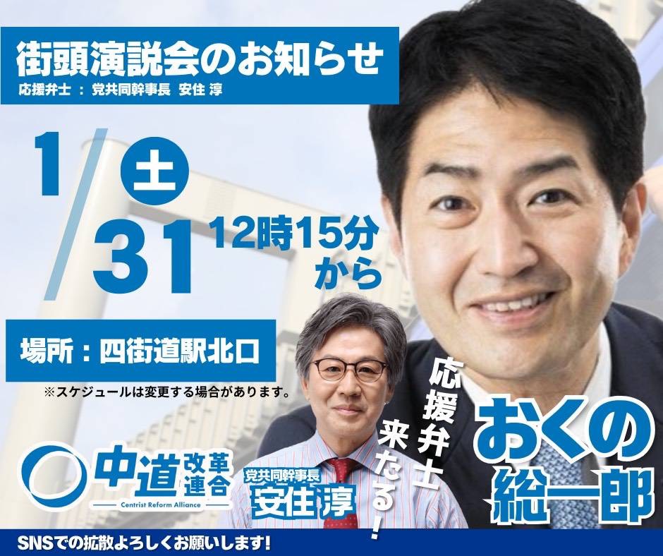 【街頭演説会のお知らせ】1月31日(土)四街道駅北口にて開催|おくの総一郎 × 応援弁士:安住淳氏