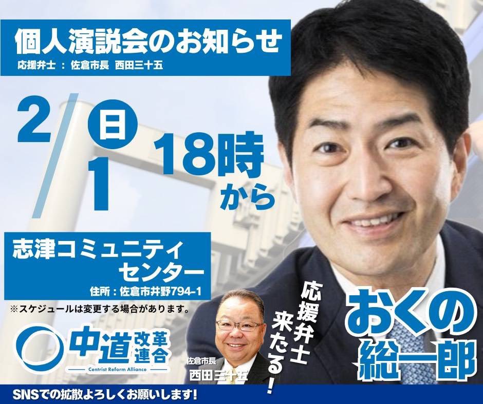 2月1日(日)18:00より、志津コミュニティセンターにておくの総一郎の街頭演説を行います!